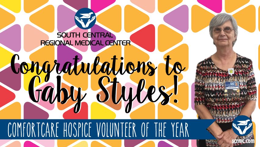 South Central Regional Medical Center Volunteer Program selected Ms. Gaby Styles as the ComfortCare Hospice Volunteer of the Year for 2016. Ms. Styles has served as a volunteer since 2013 and has donated over 675 hours of service. As a volunteer, Ms. Styles assists in the hospice office by answering phones, assembling charts, training new volunteers and assisting with other office duties. Ms. Styles lends her time by volunteering at South Central community events, such as Blood Drives and Health Fairs. Congratulations to Gaby Styles!